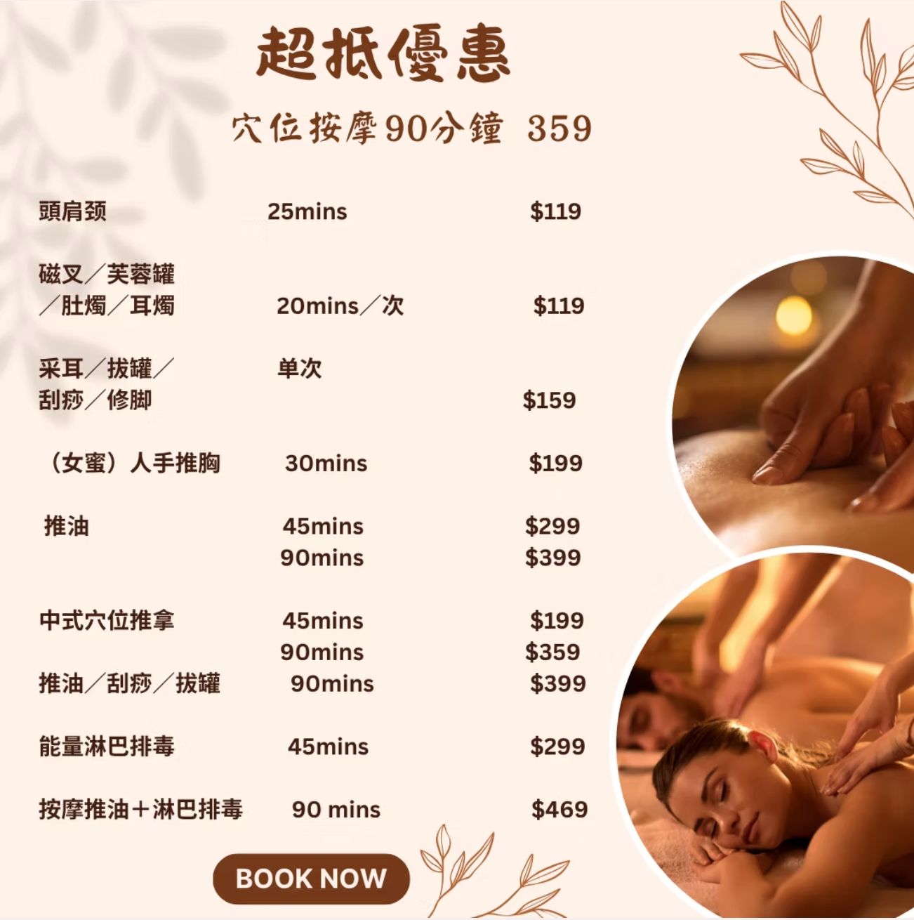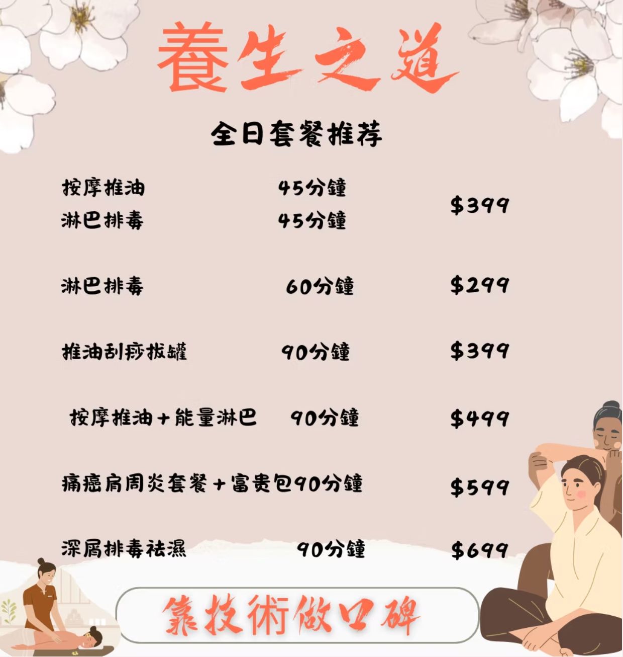 藝品養生館的一大亮點是我們的獨立按摩房。提供單人及雙人獨立房間使用,這些私密的空間設計獨特,旨在為客人提供一個安靜、舒適的環境,讓您在享受按摩服務的同時,充分感受到個人空間的尊貴與舒適。我們為每位客人提供一次性床單和毛巾,確保衛生安全。此外,我們還提供個性化的按摩套餐,令您盡情地放鬆身心,舒緩壓力。